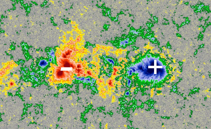 Most sunspots have a simple or magnetic configuration, like that of an ordinary bar magnet. Nearby sunspot 4248 is a good example. Sunspot 4246 is different, though. It has multiple magnetic poles crowded together in a disorganized fashion.